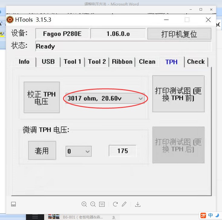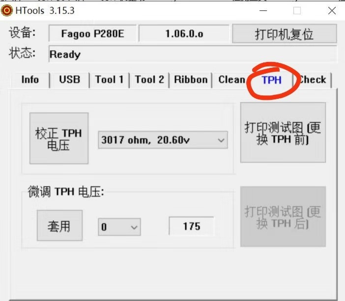 - 若色带整齐断裂或粘在卡片上,通过HTool工具调整TPH电压:在「校正TPH电压」选项中,将当前电压值降低3个单位,点击「校正TPH电压」保存设置,测试打印;如果无效,继续降低电压,直到调整到适合的值后,点击「校正TPH电压」,点击「套用」,保存设置。
