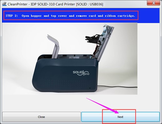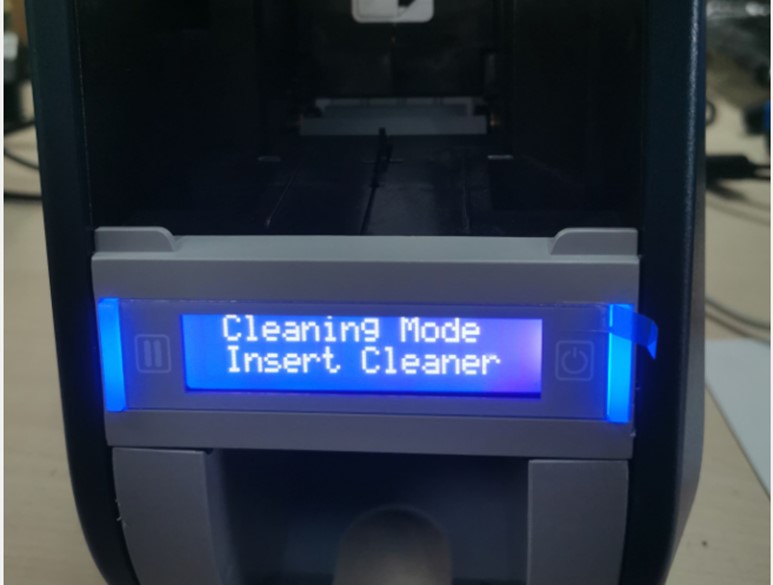 5.点击Next,打印机屏幕显示Insert Cleaner,从进卡盒插入长条清洁卡,清洁卡会自动进入通道。