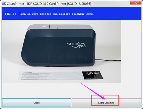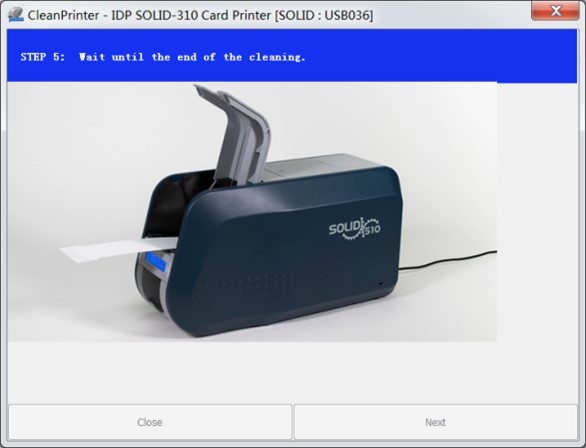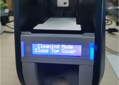 6.打印机屏幕显示Close Top Cover, 关闭打印机上盖,此时清洁卡会在通道内来回移动,清洁滚轴,数次后从前面排出。