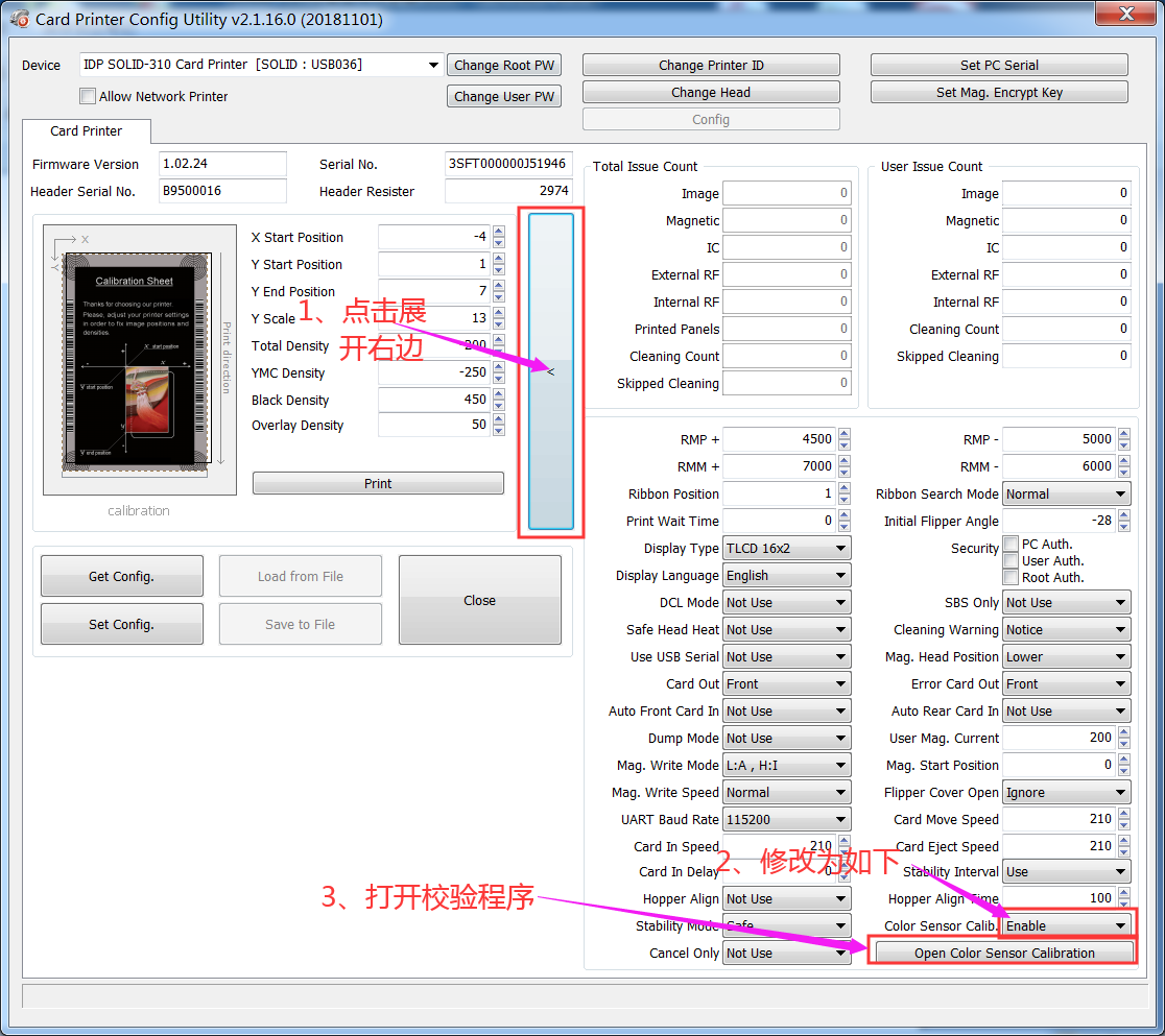 4.点击展开右边,将右下角Color Sensor Calib 修改为Enable ,点击Open Color Sensor Calibration开始校正